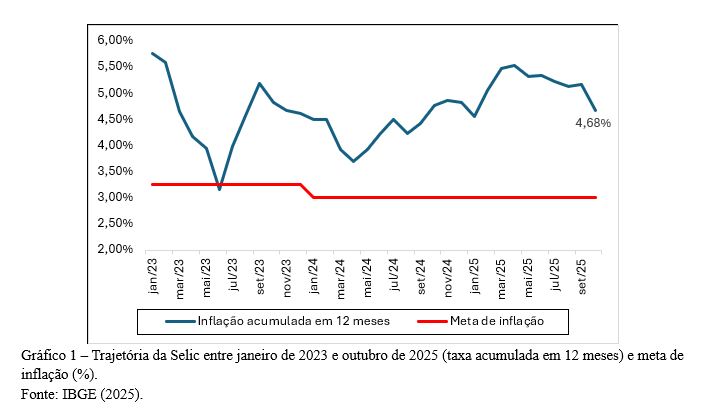 A opção por manter o juro em 15% não surpreendeu o mercado. Desde o início do segundo semestre, o Banco Central vinha sinalizando um tom mais cauteloso, após o ciclo de altas que se iniciou em 2023 para conter uma inflação que havia superado 9% em 12 meses (durante o período pandêmico). Embora os índices tenham recuado desde então, permanecem acima da meta, com projeções em torno de 4,6% para 2025 e 3,6% para 2026 (gráfico 1). A inflação de serviços – impulsionada pelo mercado de trabalho aquecido e pela demanda interna resiliente – continua sendo o principal obstáculo à convergência. A manutenção dos juros, portanto, reflete a necessidade de evitar que essa inércia se transforme em nova rodada de reajustes generalizados.