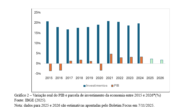 A decisão de manter a Selic em 15% tem efeitos diretos sobre a economia real. O crédito às famílias e às empresas continua caro, e o volume de concessões se estabilizou nos últimos meses. O endividamento e a inadimplência das famílias, que havia recuado em meados de 2024, voltou a crescer levemente (atualmente em 79,5% e 30,5%, respectivamente), principalmente por conta do uso de cartões de crédito e financiamento de automóveis. As empresas, por sua vez, adiaram investimentos mais arriscados, priorizando aplicações de curto prazo ou projetos de retorno rápido. O custo de oportunidade do capital, elevado, inibe expansões de capacidade produtiva, principalmente em setores como construção civil, energia e infraestrutura.